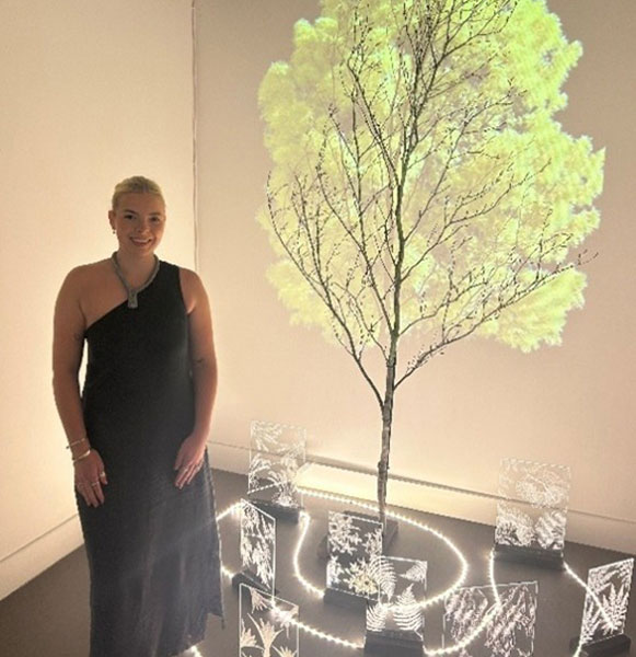 Ruby Neverman received the Emerging Graphic Design Industry for her immersive spatial design project, called Interconnection. Using projection mapping, sound, light, and tactile materials, Ruby created a multi-sensory environment depicting cycles of growth, decay, and digital evolution.